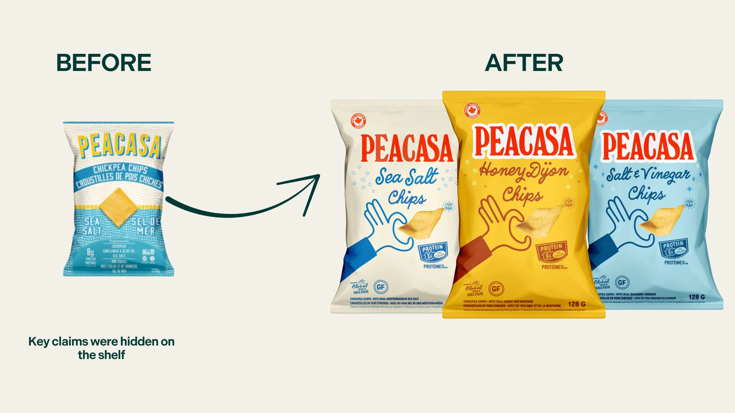 For Peacasa, a fast-growing Canadian chip brand, great product quality wasn’t enough. As they expanded into Whole Foods, Loblaws, and Sobey’s, their packaging wasn’t getting noticed. Key information like flavor name and protein content was hidden or blocked by shelf racking. Retailers were passing, and new SKUs were on hold.